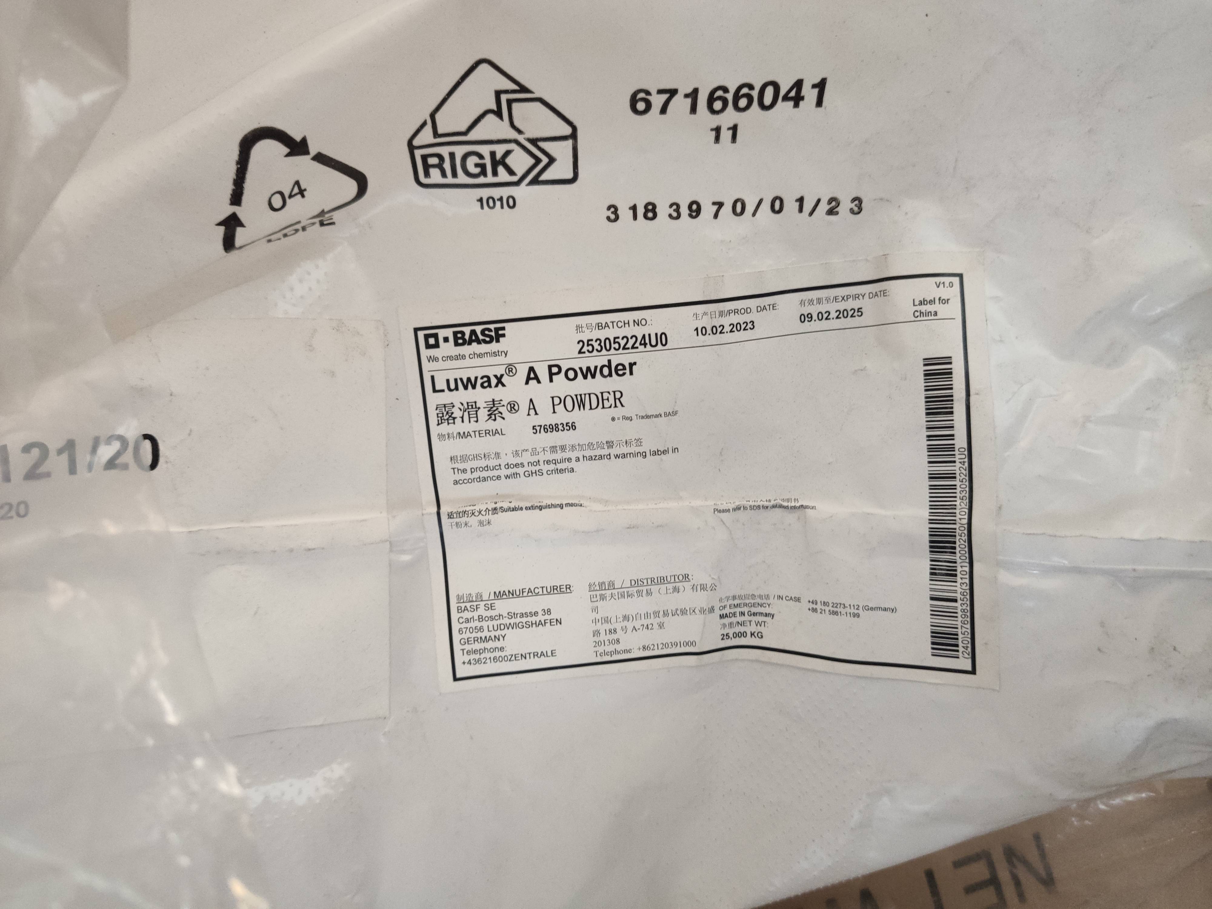 巴斯夫聚乙烯蜡Luwax®A蜡为高压无催化聚合的产物,粘度低加工性好,分子量分布窄,优良的耐热性,热稳定性良好。巴斯夫A蜡只有在色母粒的粘度在加工温度下低于欲着色的塑料,才有足够的剪切力来分散颜料,借着再加入A蜡,可降低粘度并令颜料润湿,因此来提高产量,加入蜡粉也不会对色魔的机械强度或者是抗拉及断裂生长率有不良的影响。